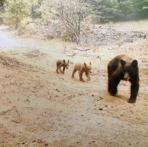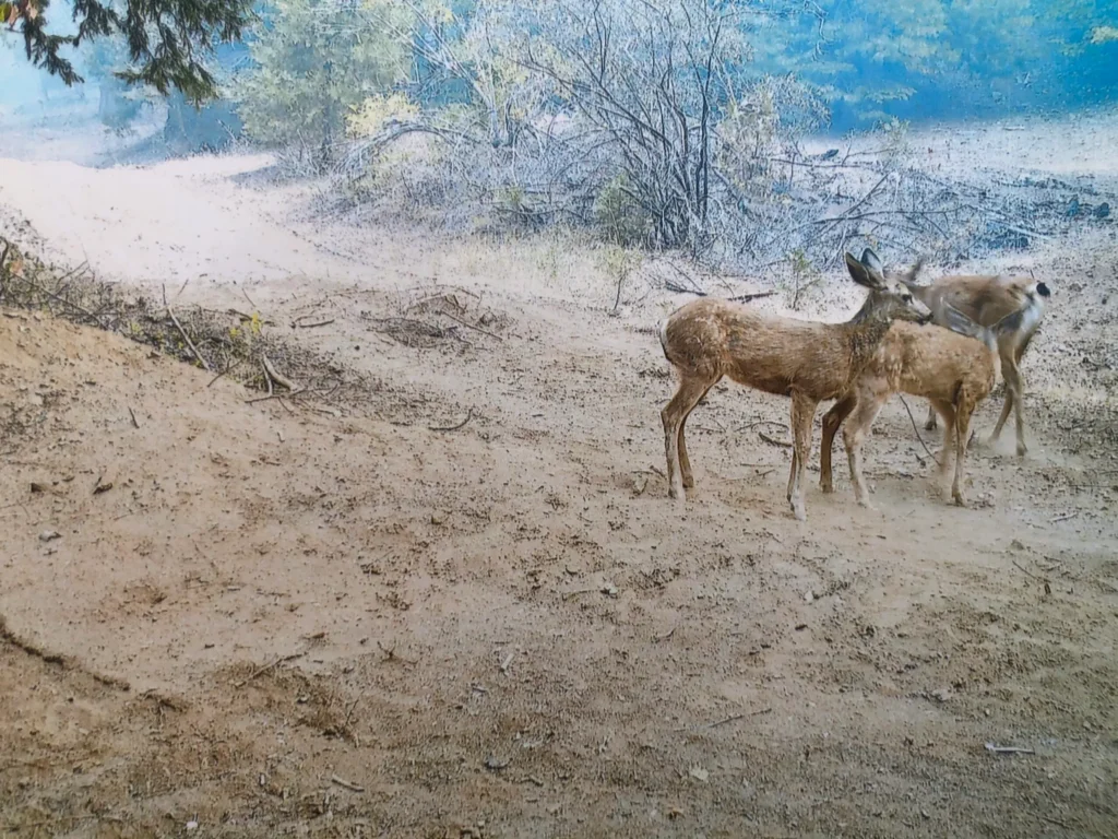 Cal Fire & the Shaver Lake Volunteer Fire Department did a heroic job of keeping the fire to a minimum as it approached our property! Apparently, the camera kept recording & it captured the fire crew working to save our land. It also captured the BIG bulldozer creating fire breaks! But… after the fire had passed, it also captured the wildlife returning. Note: the cleared area that the animals are walking & standing on. This area had been bulldozed for the fire break & that’s how we know that these animals returned after the fire and before we returned.
