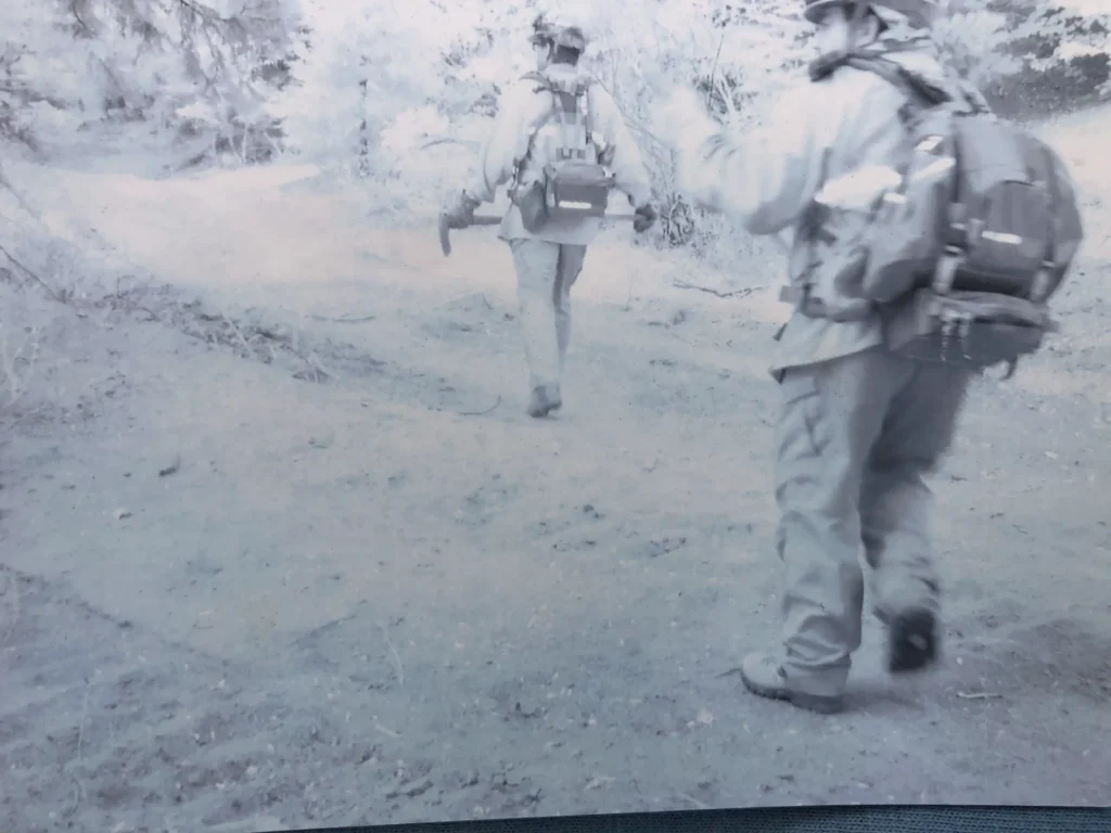A couple of hours after setting up in the West Village I noticed what I thought to be a thin faint column of smoke across the valley from us (Mt. Stevenson) and pointed it out to those around me. That single column began to grow darker and wider and was soon accompanied by a number of other columns of smoke. I was awakened to the reality of the threat when I saw the first flicker of orange flame peak through the smoke. That flicker quickly grew until the entire ridge opposite us was a mass of flames and to my horror began to descend eastward down that far slope and roar up the slope just to the west of where we were deployed. The sky grew dark with smoke turning the afternoon into night. I was shocked at that moment to hear thunder directly overhead and recall feeling so small. Until that instant I had not really accepted the reality of what was facing all of us.