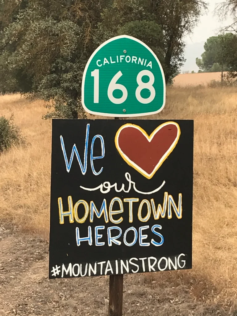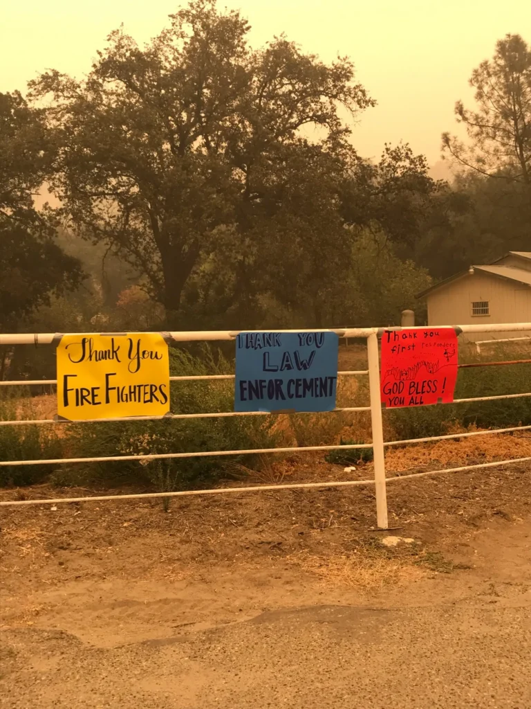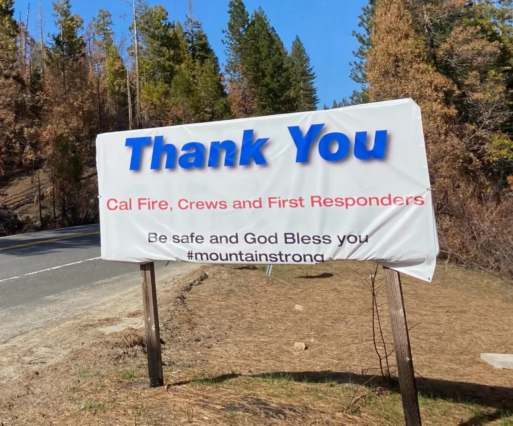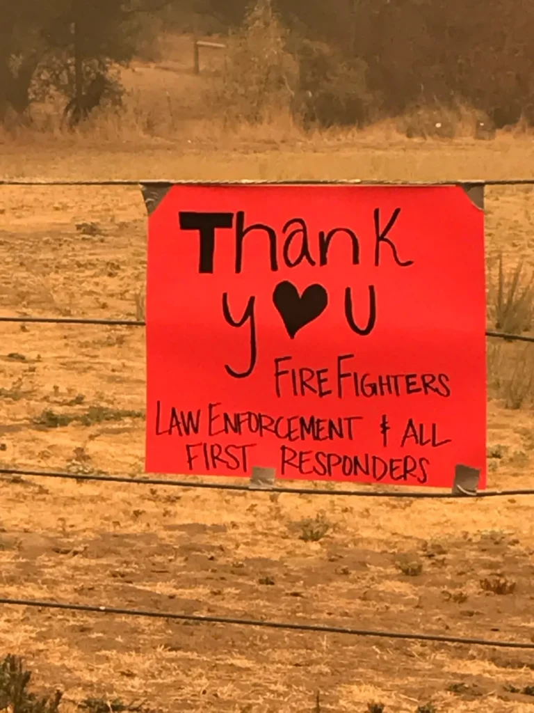 Roadside signs abound encouraging residents and thanking the first responders for their efforts during the Creek Fire.